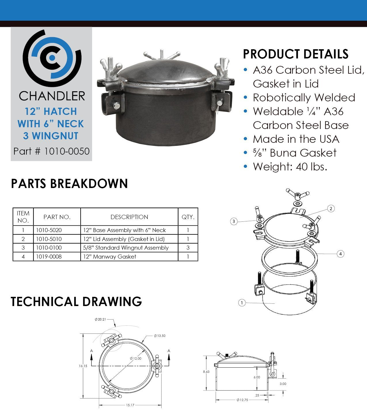 Escotilla de 12", diseño de junta en la tapa, cuello de 6" con tapa de 3 tuercas de mariposa.