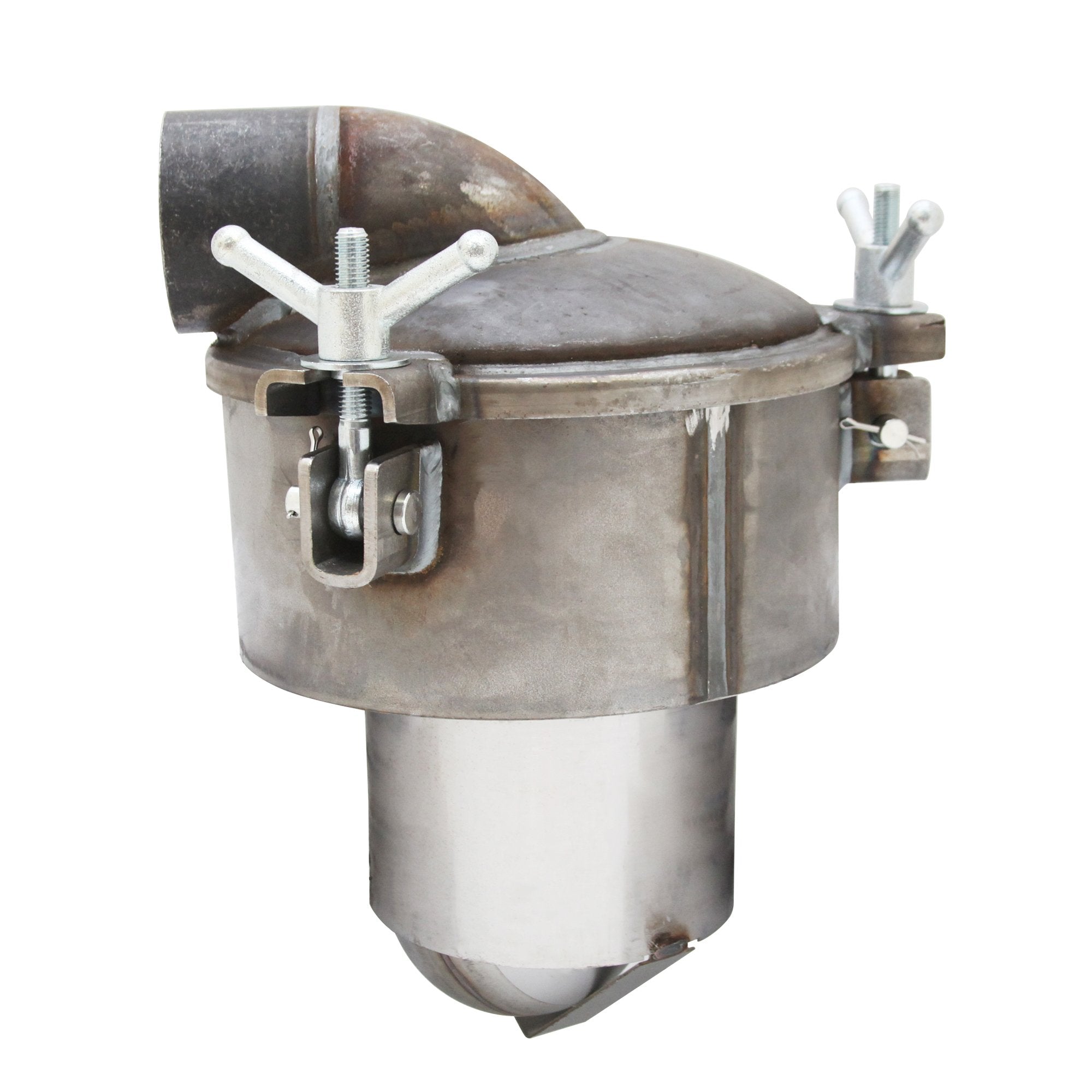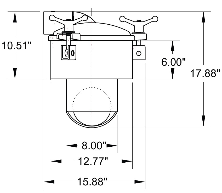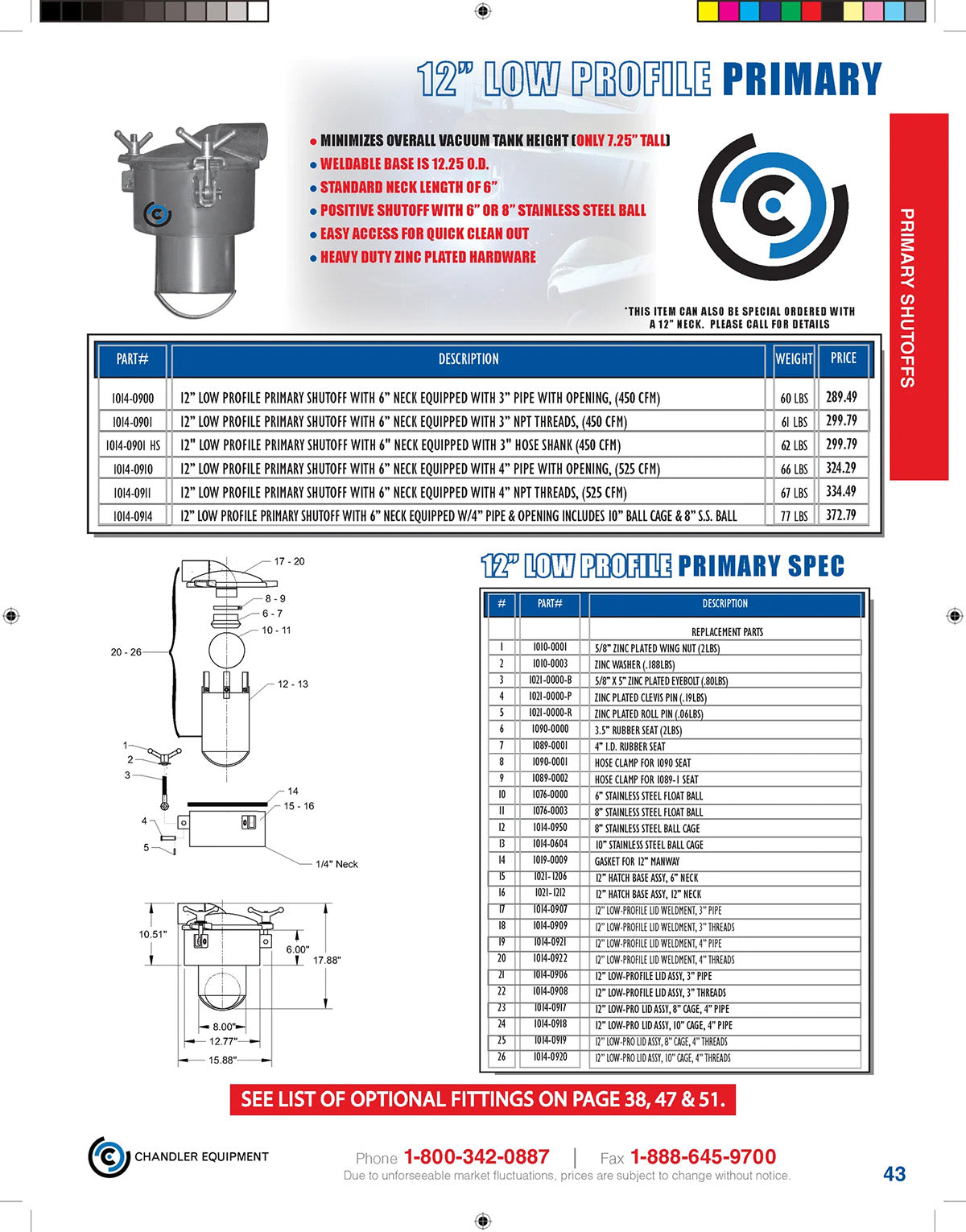 Este primario de perfil bajo minimiza la altura total del tanque de vacío. La base soldable tiene un diámetro exterior de 12,25" y la longitud estándar del cuello es de 6". Ofrece fácil acceso para una limpieza rápida y cuenta con cierre positivo con jaula de bolas de acero inoxidable de 8" o 6".